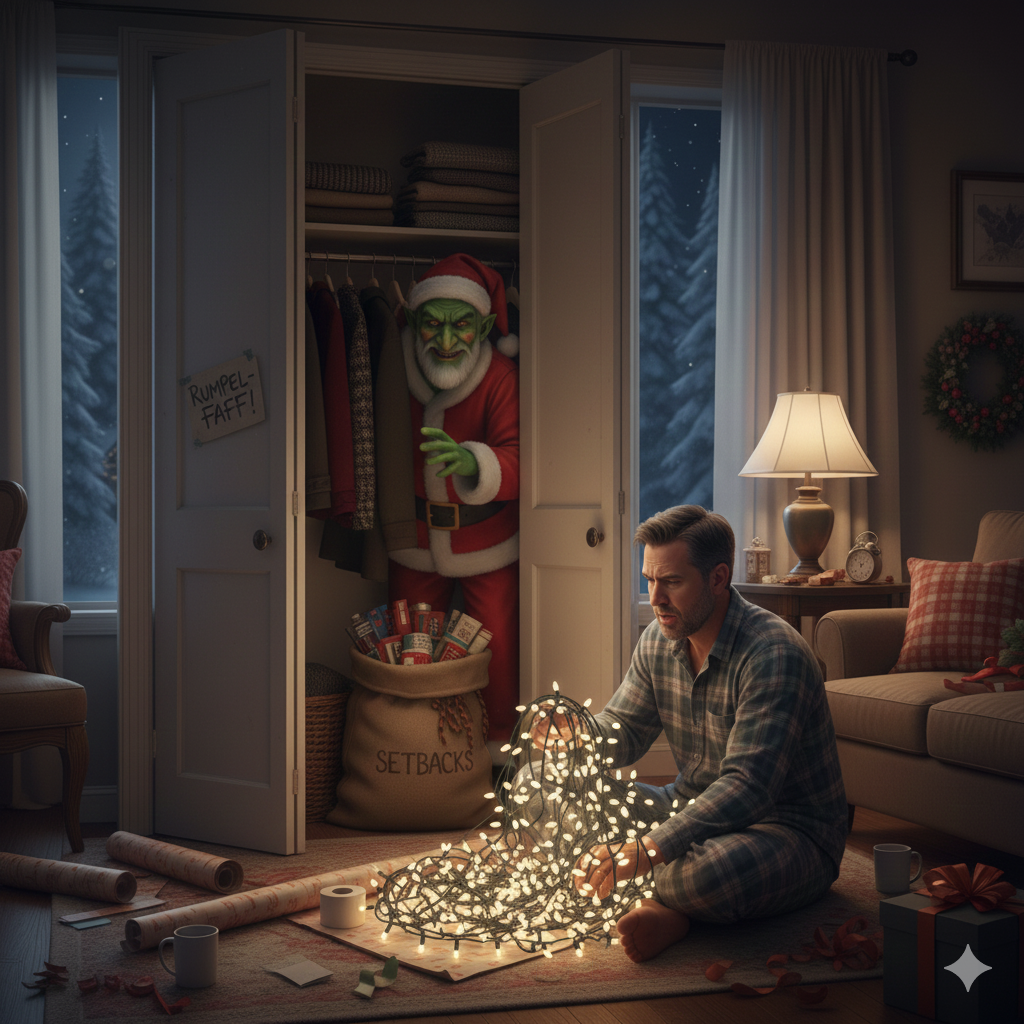 The heavy sack he carries is not a bag of gifts, nor just pranks, but the Sack of Setbacks. It is magically lined and filled with all the little things that go wrong during the holidays: